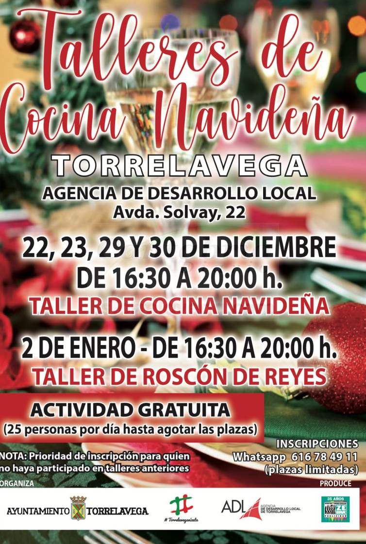 El concejal de Dinamización, Jesús Sánchez, ha anunciado la apertura del plazo de inscripción para los Talleres de Cocina Navideña organizados por el Ayuntamiento de Torrelavega a través de la Agencia de Desarrollo Local (ADL). Estos talleres se llevarán a cabo los días 22, 23, 29 y 30 de diciembre, y el 2 de enero, en horario de 16:30 a 20:00 horas, en las instalaciones del Centro Municipal de Formación de Barreda, en la Avenida Solvay, 22.