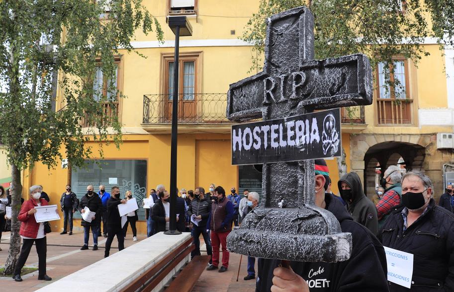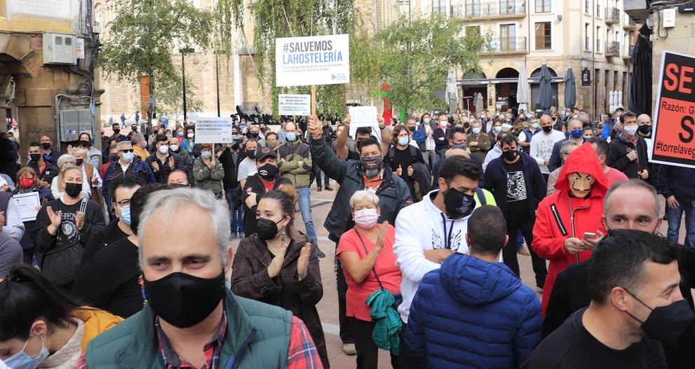 Desde los convocantes de la protesta calculan que un 50% de los locales no pueden abrir al no tener terraza, ya que la normativa que entra en vigor el sábado prohíbe la estancia en el interior de los establecimientos hosteleros.