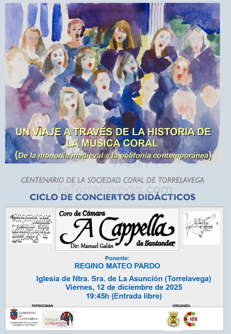 Esta tercera “lección” sobre el canto coral, tendrá lugar en la Iglesia de Nuestra Señora de La Asunción (Torrelavega), el viernes 12 de diciembre, a partir de las 19:45 horas, contando con el profesor Regino Mateo Pardo y el Coro de cámara “A Cappella” de Santander.